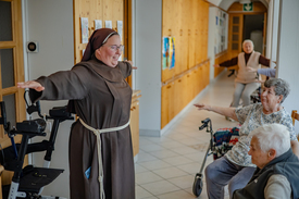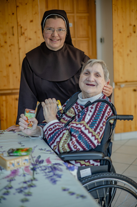 – Országos hatáskörű intézmény vagyunk, távolabbi régiókból is megkeresnek bennünket, de a környékről érkező, legsérülékenyebb egészségi állapotban lévő jelentkezőket előnyben részesítjük, hogy a családtagok, rokonok könnyebben látogathassák őket – mondja Ágnes nővér. – Ezen a vidéken kevés a bentlakásos intézmény, ezért voltaképpen hiánypótló tevékenységet végzünk. Az otthon működtetése mellett részt veszünk az idősek nappali ellátásában is, amely a magányosan élő szécsényi emberek számára gyakran átmenetet képez az otthoni lét és a végleges beköltözés költözött. Minden napnak megvan a maga megszokott rendje: a hétfő a szentmise, a kedd a hittan, a szerda az irodalom, a csütörtök a népdalkör, a péntek a kreatív foglakozások, kézművesség, játék, közös séta ideje. A családtagok számára kifejezetten megnyugtató érzés, hogy nálunk biztonságban, szeretetteljes környezetben tudhatják hozzátartozóikat. Éppen ezért fájdalmasak azok a szinte nap mint nap előforduló helyzetek, amikor férőhely hiányában sajnos vissza kell utasítanunk a jelentkezőket.