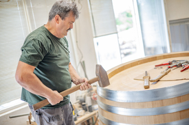 Mintha egy templomtoronyban közvetlen közelről hallgatnánk a harangszót, olyan erővel harsannak fel a vason csattanó kalapácsok. Nem csoda, hogy a munkásoknak dugó van a fülükben. Most azonban nem a szegecseket ütlegelik, hanem a feszes vaspántokat illesztik rá az egymásnak feszülő, közel két méter magas dongákra. Ha feneket is kerítenek a hordónak, lecsiszolják és lakozzák, jöhet a hitelesítés, amelynek során vízzel töltik fel, és ha kiállja a próbát, egyedi azonosítót kap. Ilyen óriási ászokhordót kevesen csinálnak ma már, Várda Tibor műhelyében is csak körülbelül száz darab készül évente. A borászok az utóbbi évtizedekben sajnálatos módon, de érthető okokból a gépekkel készített, kisebb méretű, olcsóbban beszerezhető úgynevezett barrique hordókat részesítik előnyben. Ezeknek azonban jóval rövidebb az élettartamuk, két-három használat után általában cserére szorulnak, míg nagyobb rokonaik jó tartás esetén évtizedekig szolgálják gazdájukat.