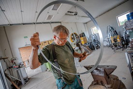 – Régebben a szegecseket is kézzel ütöttük el. Egy szegecset nagyjából 35-40 ütéssel lehet laposra préselni. Vasanként három szegeccsel kell számolni, egy hordón pedig tíz abroncs van, ami azt jelenti, hogy a munkafolyamat végéig közel 1200-szor kell a magasba lendítenünk a háromkilós kalapácsot, aztán teljes erővel lesújtanunk vele.