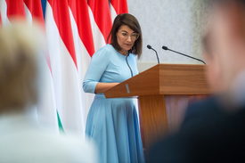 Illés Boglárka, a KKM kétoldalú kapcsolatok fejlesztéséért felelős államtitkára a Kemenes Cukrász Manufaktúra Kft. beruházásáról tartott sajtótájékoztatón a Külgazdasági és Külügyminisztériumban (KKM) 2024. május 9-én