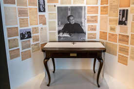 A látogatóközpont első emeletén berendezett életműtárlat a csehimindszenti születéstől a politikai üldöztetés korszakán át az Ausztriában töltött utolsó évekig, tematikus keretek között mutatja be a bíboros életútját.