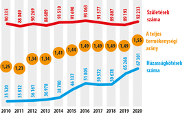 A népesedés szempontjából kiemelkedően fontos teljes termékenységi arány tavaly 1,55-ra nőtt, ez is biztató annak tudatában, hogy e mutató 2011-ben, a mélyponton 1,23 volt. A trendre jellemző, hogy 1995 óta nem volt ilyen magas ez a ráta. Igaz, a népesség megőrzéséhez szakmai közmegállapodás szerint szükséges 2,1-es számot 1977 óta nem értük el. A folyamat mégis ígéretes, és ha továbbra is ilyen ütemben nő a születésszám, elméletileg húsz év múlva ismét eljuthatunk az áhított mutatóig, vagyis akkor ki lehet majd jelenteni, hogy megállt a népességfogyás.