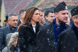 Madéfalva, 2023. január 7. Varga Judit igazságügyi miniszter (b4) és Potápi Árpád János, a Miniszterelnökség nemzetpolitikáért felelõs államtitkára (b) a madéfalvi veszedelem 259. évfordulóján tartott megemlékezésen a vérengzés emlékmûvénél a székelyföldi Madéfalván 2023. január 7-én.