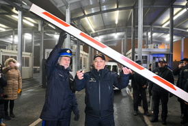 Balogh János országos rendőrfőkapitány (b) és Cornel-Laurian Stoica főfelügyelő, a Román Határrendőr Főfelügyelőség vezetője jelképesen megnyitja a Magyarország és Románia között húzódó államhatárt Románia schengeni övezethez csatlakozásának alkalmából a csanádpalotai határátkelőhelyen