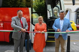Kardos István, a Magyar Vöröskereszt főigazgatója, Bayerné Matusovits Andrea, az Országos Vérellátó Szolgálat főigazgatója és Takács Péter, a Belügyminisztérium egészségügyért felelős államtitkára (b-j) átvágja a nemzeti színû szalagot a Magyar Vöröskereszt új véradóbuszának ünnepélyes átadásán Budapesten 2023. szeptember 8-án
