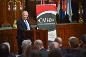 Semjén Zsolt beszédet mond a kedvezménytörvény hatályba lépésének és a Concordia Minoritatis Hungaricae (CMH) Polgári Egyesület megalakulásának huszadik évfordulója alkalmából rendezett ünnepi tanácskozáson Szabadkán, a városháza dísztermében 2022. március 4-én