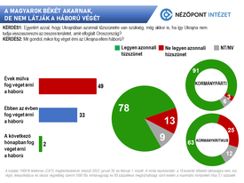A Nézőpont szerint a magyarok többségét békepárti elvárások, ugyanakkor „borúlátó várakozások” jellemzik: majdnem a felük (49 százalék) szerint a konfliktus még évekig elhúzódik, és csupán egyharmaduk (33 százalék) számít arra, hogy 2023-ban rendezni tudják a helyzetet.