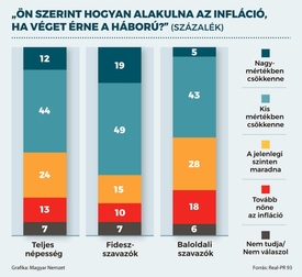 Jelentős eltérés van azok számában is, akik az infláció mértékének jelenlegi szinten maradását feltételezik a háború befejeződése esetén is: a fideszesek körében csak 15 százalék, a baloldaliak között csaknem kétszer ekkora, 28 százalék ez az arány.