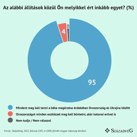 Azt írták: a felmérés alapján egyértelműen kijelenthető, hogy a magyarok elsöprő többsége a béke megőrzését szorgalmazza a kialakult feszült helyzetben. A válaszadók 95 százaléka úgy látja, hogy mindent meg kell tenni a béke megőrzése érdekében Oroszország és Ukrajna között, ugyanakkor 4 százalékuk szerint Oroszországot minden eszközzel meg kell büntetni, akár katonai erővel is.