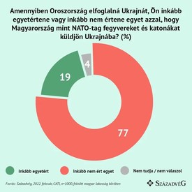 Az ezzel kapcsolatos válaszok szerint a magyarok több mint háromnegyede (77 százaléka) nem ért egyet azzal, hogy Ukrajna Oroszország általi elfoglalása esetén Magyarország mint NATO-tag fegyvereket és katonákat küldjön a térségbe, ezzel szemben 19 százalékuk helyeselné ezt a lépést.