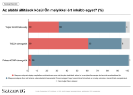 Az eredmények azonban arra is rámutatnak, hogy Magyar Péter az energiaellátás műszaki és gazdasági kérdését ideológiai síkra terelte saját támogatói körében. A Tisza-szimpatizánsok 59 százaléka még akkor is betiltaná az orosz olaj- és gázvásárlásokat, ha az jelentős energia- és üzemanyagár-emelkedéssel járna. Ezzel szemben a kormányzó pártszövetség szavazóinak elsöprő többsége a teljes lakosságra nézve domináns, pragmatikus állásponttal ért egyet, és nem vágná el a kereskedelmi kapcsolatokat Oroszországgal – írja a Századvég.