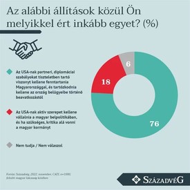 Azoknak az aránya, akik indokoltnak tartják az USA aktív szerepvállalását a magyar belpolitikában, továbbá azt, hogy az Egyesült Államok – amennyiben szükségesnek ítéli – vonja kritika alá a magyar kormányt, 18 százalékra tehető.