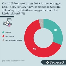 Ehhez hasonlóan a válaszadók közel kétharmada (65 százaléka) nem ért egyet azzal, hogy az USA nagykövetsége közvetlenül véleményt nyilvánítson magyar belpolitikai kérdésekben, míg 31 százalékuk helyeselné ezt.