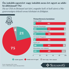 A kutatási adatok tanúsága szerint a megkérdezettek háromnegyede (75 százaléka) nem támogatná, hogy az Amerikai Egyesült Államok és Brüsszel nyomására Magyarország elzárja a hazánkba érkező orosz kőolajat és földgázt, ugyanakkor 21 százalékuk nem kifogásolná ezt. Fontos hangsúlyozni, hogy