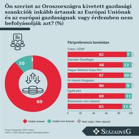 A kutatás rámutat, hogy a legnagyobb arányban a Fidesz–KDNP (92 százalék) és a Mi Hazánk Mozgalom (90 százalék) támogatói ítélik kedvezőtlennek a szóban forgó szankciókat az európai gazdaságra nézve, ugyanakkor az ellenzéki összefogás (86 százalék) és a Magyar Kétfarkú Kutya Párt (87 százalék) szimpatizánsainak meggyőző többsége is ugyanezt a véleményt fogalmazta meg.