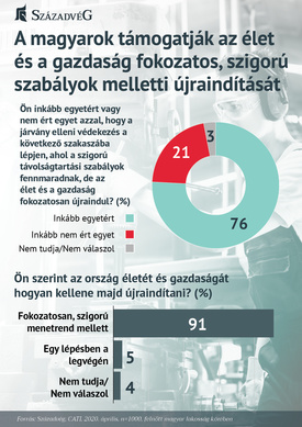 Az alapítvány fontos tartja kiemelni: a magyarok támogatják, hogy az ország a védekezés következő szakaszába lépjen. A megkérdezettek több mint háromnegyede (76 százaléka) egyetért az élet, illetve a gazdaság fokozatos újraindításával, ezzel szemben a 21 százalékuk ellenzi ezt.