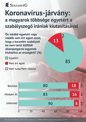 A kutatásból kiderült, hogy a politikai önbesorolás mentén sem tapasztalhatók jelentős eltérések: a baloldali szavazók 80, valamint a középen állók 83 százaléka szükségesnek tartja a járványügyi szabályokat megszegő külföldi állampolgárok kiutasítását, míg 18 illetve 16 százalékuk ezt nem látja indokoltnak. A jobboldali választók tekintetében ez az arány 90, illetve 8 százalék.