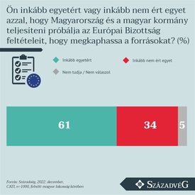 November 30-án az Európai Bizottság bejelentette, hogy támogatja az uniós helyreállítási alap forrásainak lehívására vonatkozó magyar terv elfogadását, amely 5,8 milliárd euró (hozzávetőlegesen 2300 milliárd forint) vissza nem térítendő támogatás felhasználását teszi lehetővé Magyarország számára. A brüsszeli testület ugyanakkor a kohéziós források tekintetében fenntartotta további 7,5 milliárd euró (hozzávetőlegesen 3000 milliárd forint) zárolását, valamint a kifizetéseket 27 „szupermérföldkőhöz” kötötte. A Századvég decemberi közvélemény-kutatása feltérképezte, hogy a lakosság hogyan viszonyul a magyar kormány törekvéseihez az uniós források kifizetése érdekében, kitérve a Brüsszel által szabott újabb feltételek megítélésére – olvasható Századvég Alapítvány közleményében.Magyarország teljesítette a kifizetéshez szükséges feltételeket