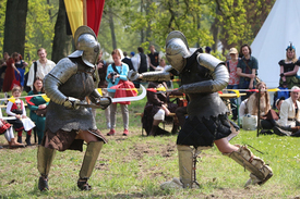 Gladiátor viadal a hollandiai De Haar kastélyban, amelynek története bár nem a római korig, csak a középkorig nyúlik vissza, de látogatóit arra ösztönzi, hogy elmerüljenek az évszázadok lenyűgöző legendáiban. A képen a Familia Gladiátora Pannonica harcosai küzdenek. / Fénykép: Weixelbaum Laura