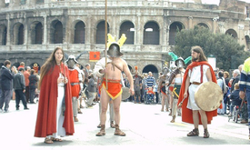 Bemutatón az örök városban, Rómában. Háttérben a Colosseum, ami valójában egy óriási anfiteátrum, s amely Kr. u. 80-ra épült fel. Majd 2000 évvel ezelőtt, az avatóünnepségen 5000 vadállatot vonultattak föl. Mi lehetett ott, Te jó Isten? / Fénykép Orlik Edit