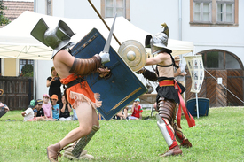 „A küzdelmek nem koreografáltak, rendszeres edzések és az ókorban már kifejlesztett fegyvernemi felszerelések, valamint az eltérő fegyvernemek párosítása az, amik segítenek elkerülni a sérüléseket. Tehát a küzdelmekben megvannak a harcosi lét veszélyei, kihívásai és nehézségei, na és a győzelmek átélése is.” / Fénykép Orlik Edit
