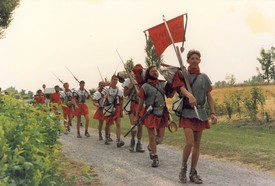Majd három és fél évtized távlatából ez a kicsit megkopott fénykép tanúskodik az egykori római hadiúton, a Limesen haladó nagymenetről, Aquincum és az ausztriai Carnuntum között. /1990 – megérkezés a carnuntumi legióstábor amfiteátrumába./ Fénykép: Orlik Edit