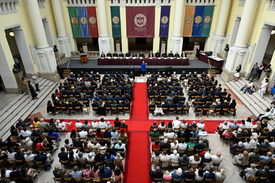 A Budapesti Mûszaki és Gazdaságtudományi Egyetem ünnepi szenátusi ülése az egyetem központi épületének aulájában 2025. május 31-én.