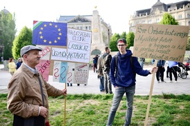 Európához tartozunk! jelmondattal demonstrálnak a Momentum Mozgalom szervezésében Budapesten hétfő este, Magyarország uniós csatlakozásának tizenharmadik évfordulóján.Európához tartozunk! jelmondattal demonstrálnak a Momentum Mozgalom szervezésében Budapesten hétfő este, Magyarország uniós csatlakozásának tizenharmadik évfordulóján.