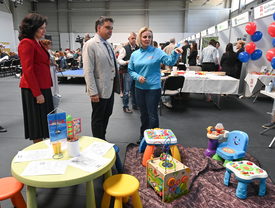 Fûrész Tünde, a Kopp Mária Intézet a Népesedésért és a Családokért (KINCS) elnöke (b) és Latorcai Csaba, a Közigazgatási és Területfejlesztési Minisztérium parlamenti államtitkára (k) a Családbarát Települések Expo megnyitóján a tatai Güntner Aréna Városi Sportcsarnokban 2025. május 10-én.