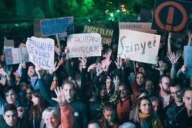 A tömegben állók egyebek mellett „Tanáraim nélkül félember lennék”, „Érzem, hogy butulok”, „Szülj még egy tanárt”, „Nincs tanár, nincs jövő” transzparenseket emeltek a magasba és azt skandálták, „Szabad ország! Szabad oktatás!”.
