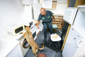 Nem nehéz kitalálni, hogy melyik a NAV kutyakiképző bázisa Külső-Ferencváros egyik gyárövezetében, a csaholás ugyanis már messziről hallatszik az intézmény zöld kerítésének túloldaláról. A bejáratnál Hortobágyi Ferenc pénzügyőr alezredes, osztályvezető fogad, és mindjárt körbe is vezet bennünket. Látogatásunk időpontja nem véletlen: Varga Mihály pénzügyminiszter nemrégiben elismerő oklevéllel tüntette ki a vámhivatal három legsikeresebb négylábú munkatársát és vezetőiket, akik közül ketten ez alkalommal is a helyszínen tartózkodnak.