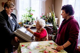 A szavazatszámláló bizottság egyik tagja mozgóurnával egy szavazó idõs nõ tanyáján az országgyûlési választáson és gyermekvédelmi népszavazáson Petõfiszálláson 2022. április 3-án.