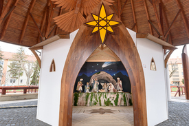 „Adjon az Isten szerencsét, szerelmet, forró kemencét, üres vékámba gabonát, árva kezembe parolát…” – áradnak szét Nagy László áldást kérő verssorai hangfelvételről az ország legszebb betlehemében, a makói Makovecz téren. A Maros partján fekvő város kulturális központjában a Hagymatikum Zenepavilonjának hatalmas griffmadárszárnyai alatt, advent kezdetén állították fel a betlehemet, amely első helyezést nyert a Magyar Turisztikai Ügynökség és a Hungarofest Nonprofit Kft. közösen meghirdetett pályázatán.