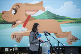 Szentkirályi Alexandra kormányszóvivő beszél a MÁV-Volán-csoport Hol vagy, Kajla? programjának sajtótájékoztatóján a Déli pályaudvaron 2023. március 31-én