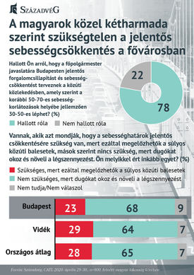 A magyarok mintegy kétharmada (65 százaléka) szerint szükségtelen a jelentős sebességcsökkentés a fővárosban – derül ki a Századvég pénteken nyilvánosságra hozott közvélemény-kutatásából.A kutatás szerint a válaszadók 65 százaléka szerint nincs szükség a sebességhatárok jelentős csökkentésére Budapesten, mert az forgalmi dugókat okoz és növeli a légszennyezést. A megkérdezettek alig több mint negyede (28 százalék) látja csak úgy, hogy a sebességhatárok jelentős csökkentésével megelőzhetők a súlyos közúti balesetek.