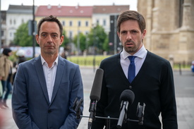 Magyar Levente (j) és Csoma Botond (b) sajtótájékoztatót tart Kolozsváron, a Fő tér és a Szentegyház utca sarkán