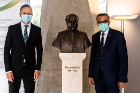 Szijjártó Péter és Tedrosz Adhanom Gebrejeszusz, az Egészségügyi Világszervezet (WHO) etióp főigazgatója Genfben, az Egészségügyi Világszervezet épületében lévő Semmelweis Ignác-szobornál találkozójukon 2020. október 13-án