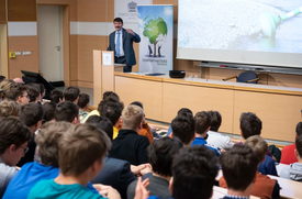 Áder János köztársasági elnök a 7. Kárpát-medencei Fenntarthatósági Témahét című rendezvénysorozat nyitónapján klímaváltozással kapcsolatos előadást tart a budapesti Piarista Gimnázium diákjainak 2022. április 25-én