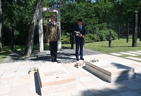 Áder János köztársasági elnök virágot helyez el az 1956-os forradalom névtelen áldozatainak sírjánál a Rákoskeresztúri új köztemető 301-es parcellájában az 56-os vértanúk emléknapja alkalmából, a néhai miniszterelnök és mártírtársai kivégzésének 63. és újratemetésének 32. évfordulója előtti napon, 2021. június 15-én. Mellette Kun Szabó István fõhadsegéd