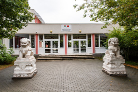 Esős, szeptemberi napon keressük fel az iskolát. Nagyobb diákok egy csoportja siet az épület felé. Gimnazisták, magyarok és kínaiak vegyesen. Két hatalmas kőoroszlán őrzi a főbejáratot, de a diákok nem ijednek meg tőlük. A lakótelepi környezetbe illeszkedő, ugyanakkor minden igényt kielégítő, tágas épület falai közt rendkívül fegyelmezett munka folyik.