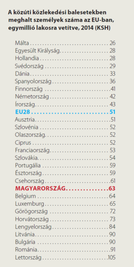 A KSH adatai szerint a magyar közlekedésbiztonság legrosszabb éve 1990 volt, amikor 2432 ember halt meg közlekedési balesetben. Azóta sokat javult a helyzet, 2013-óta évente átlagosan 600 halálos kimenetelű közlekedési balesetet regisztrálnak. De Magyarország az európai uniós átlagnál még mindig valamivel rosszabbul teljesít. Jelenleg egymillió hazai lakosra évi 61-80 halálos baleset jut, míg az EU tagállamainak átlaga 50 körül mozog. Ugyanakkor Európa egyes országaiban, például Norvégiában, Svédországban vagy Svájcban 30 körüli az egymillió lakosra jutó halálos balesetek száma – köszönhetően a szigorú büntetési rendszernek és a lakosság közlekedési kultúrájának.