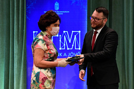 Nagy Andrea csecsemő- és gyermekgyógyász, neonatológus, a Debreceni Egyetem Klinikai Központ Gyermekgyógyászati Klinikája Perinatológiai és Gyermek Idegsebészeti Osztályának vezetője, klinikai főorvosa átveszi a Magyar Érdemrend lovagkereszt polgári tagozat kitüntetést Schanda Tamástól, az Innovációs és Technológiai Minisztérium parlamenti és stratégiai államtitkárától a Pesti Vigadóban