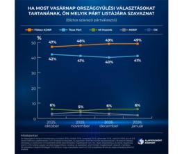 A kormánypártok jelentős – de nem behozhatatlan – fölénye 2026 év elején is megmaradt: a biztos szavazó pártválasztók 49 százaléka szavazna egy most vasárnap esedékes választáson listájukra, míg Magyar Péterék megtorpantak, a Tiszát támogatók aránya 40-42 százalék között mozgott az utóbbi hónapokban – írták