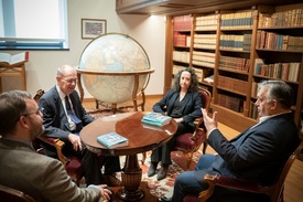 A Miniszterelnöki Sajtóiroda által közreadott képen Orbán Viktor miniszterelnök (j) fogadja John Mearsheimer világhírű amerikai politológus professzort (b2) a Karmelita kolostorban 2022. november 8-án. Balról Orbán Balázs, a miniszterelnök politikai igazgatója