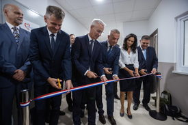 Proszenyák Zsolt István intézményvezetõ (b2), Soltész Miklós, a Miniszterelnökség egyházi és nemzetiségi kapcsolatokért felelõs államtitkára (b3), Zvonko Milas, a Határon Túli Horvátok Központi Hivatalának államtitkára (b4), valamint Mladen Andrlic horvát nagykövet (j) a Collegium Croaticum Horvát Szakkollégium kormányzati támogatással megvalósult új, a magyar felsõoktatásban részt vevõ horvát nemzetiségû hallgatók kollégiumi elhelyezését szolgáló épületének átadásán Pécsen 2023. augusztus 31-én.