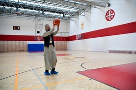 Kocsis Fülöp görög katolikus érsek-metropolita kosárlabdával a kezében a debreceni Szent Efrém Óvoda, Általános Iskola és Alapfokú Mûvészeti Iskola sportcsarnokának avatásán 2020. szeptember 12-én