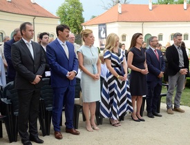 Áder János köztársasági elnök (b2 és felesége, Herczegh Anita (b3), Varga Judit igazságügyi miniszter (b5), Barcza Attila, a térség fideszes országgűûlési képviselője (b), Egresitsné Firtl Katalin, az Eszterháza Kulturális, Kutató- és Fesztiválközpont Közhasznú Nonprofit Kft. ügyvezetője (b4), Szmrecsányi Boldizsár (művésznevén Boldi) szobrászművész (j2) és Incze Mózes festõmûvész (j) a csaknem kétmilliárd forintból felújított fertõdi Esterházy-kastély nyugati szárnyának átadóünnepségén a kastély díszudvarán 2021. július 18-án