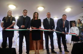 Takács-Czók Melinda, a ViPo-Home Kft. ügyvezetője, Hörcsik Richárd, a térség fideszes országgyűlési képviselője, Varga Judit igazságügyi miniszter, Németh Zsolt, a Fidesz parlamenti képviselője, az Országgyűlés külügyi bizottságának elnöke és Orbán József (Független) polgármester (b-j) átvágja a nemzeti színű szalagot Nyíriben, a település megújult művelődési házának átadóünnepségén 2022. december 17-én