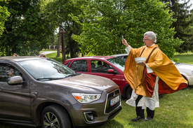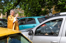 Szép, felemelő a mise. Főhajtás egyben az édesanyák előtt, és könyörgés azért, hogy a Mindenható vegye le rólunk a járvány átkát. Elkerülendő a fertőzéseket, csak a kocsik templom felé eső ablakát szabad valamennyire leengedni. Kiszállni tilos, odabent, az utastérben kell követni a szertartást. Átváltoztatásnál és úrfelmutatásnál elmaradnak a szokásos csengőhangok, most az autódudák szólalnak meg helyettük. Előbbinél rövid, utóbbinál hosszú kürt. Az atya úgy nevezi, a résztvevők interaktív ministránsszolgálata… A szükség és a kényszer úgy hozta, hogy eddig csak lélekben áldozhattak a hívek az autós miséken, Miklós atya azonban most már igazi szentostyát oszt szét a közösség tagjai között. Kesztyűt húz, és személyesen viszi oda a lezárt csomagot minden kocsihoz.
