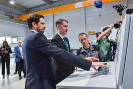 Magyar Levente, a Külgazdasági és Külügyminisztérium parlamenti államtitkára (b) és Pásztor Bálint, a Vajdasági Magyar Szövetség elnöke (b2) a szabadkai Aktív Ipari, Építõipari és Kereskedelmi Kft. betonacél-hajlító üzemének átadásán.